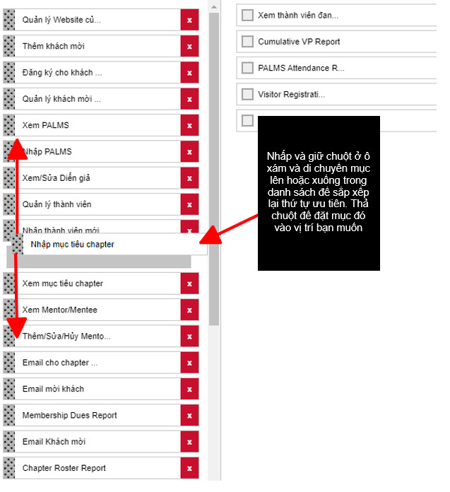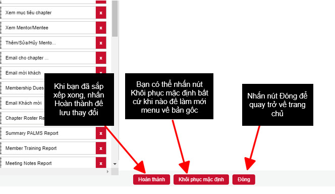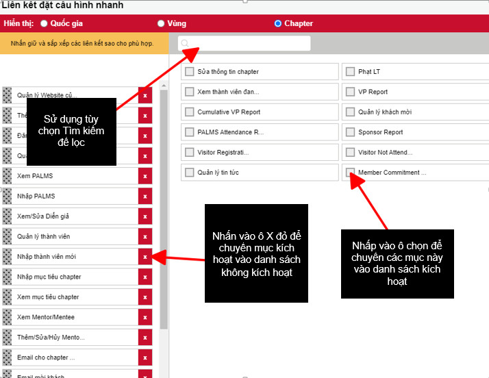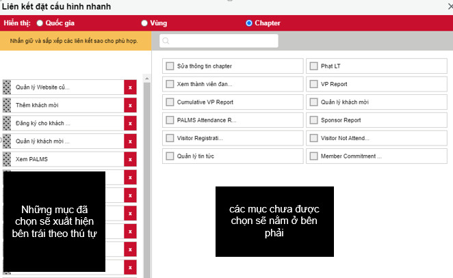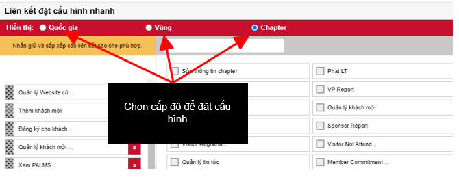 Bạn sẽ có một vài phím tắt có sẵn cho mỗi cấp độ mà bạn được phép truy cập. Ví dụ, nếu là thành viên, bạn sẽ chỉ xem được mục “Chapter”. Nếu là giám đốc, bạn có thể thêm mức độ truy cập cho các chức năng và báo cáo cấp vùng. Ở mỗi cấp độ, bạn có thể đặt cấu hình độc lập cho mỗi chức năng bạn muốn.